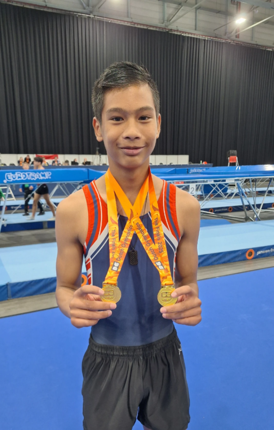 Kwin Oldewarris (13) uit Vianen pakt goud en zilver op het NK Trampolinespringen